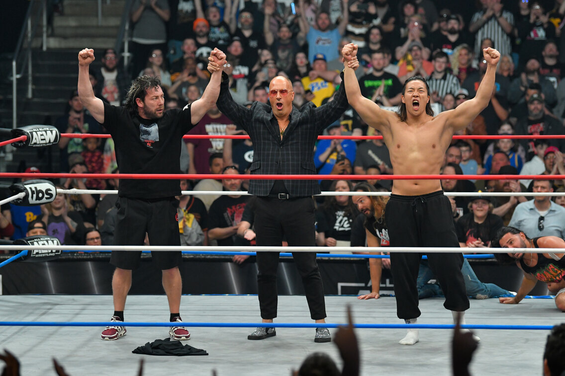 After footage of Takeshita rescuing The Elite from an attack by the BCC last week aired, Don Callis, Takeshita and The Elite were shown backstage. Callis and the Young Bucks were really thankful to Takeshita for what he did but Omega seemed uneasy with him being there. The Bucks would later say Takeshita is an “honorary” member of The Elite.