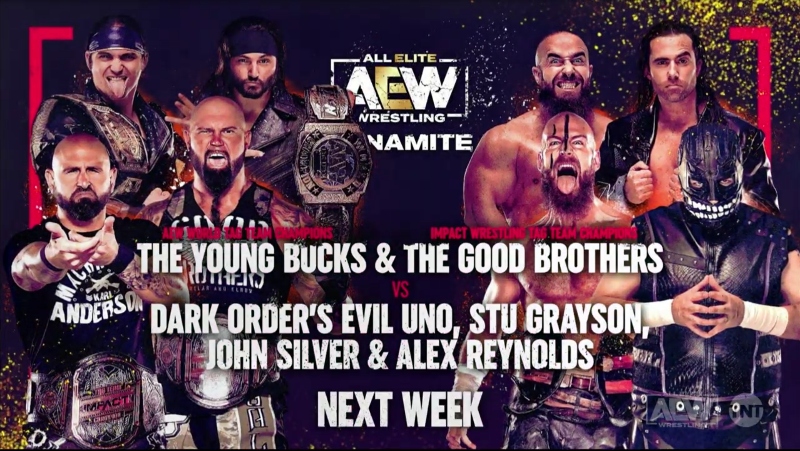 Despite some interfaction strife between the former Bullet Club members that played out Wednesday, The Young Bucks and the Good Brothers (Anderson and Gallows) will face John Silver, Alex Reynolds, Stu Grayson and Evil Uno of the Dark Order next week.