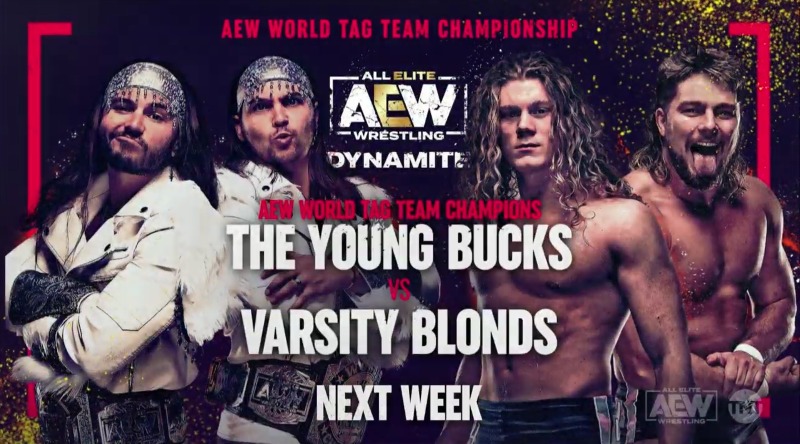 After ending SCU’s run as a tag team, AEW Tag Team Champions The Young Bucks will look to keep their momentum going on next week’s Dynamite as they defend against the Varsity Blonds.