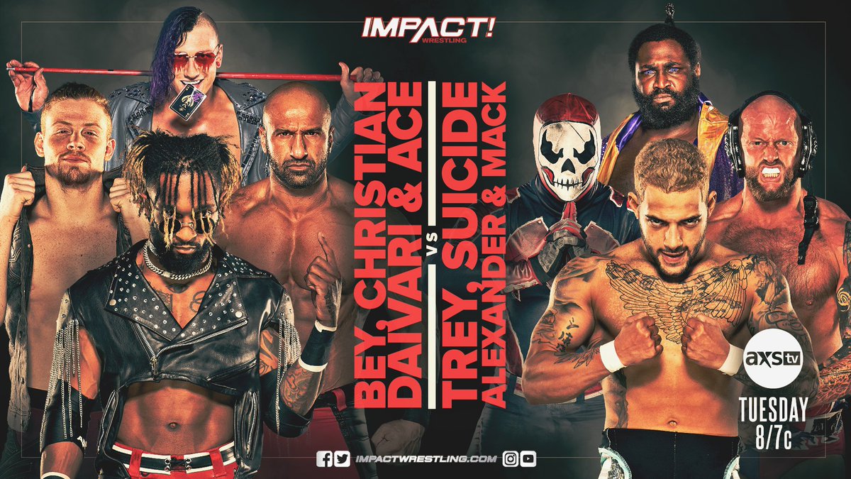 Impact Wrestling has announced that Trey Miguel, Josh Alexander, Willie Mack & Suicide vs. Chris Bey, Ace Austin, Blake Christian & Daivari will take place on Tuesday’s episode of Impact. The match involves the eight participants who will be taking part in the first-ever “Triple Threat Revolver match” at No Surrender.