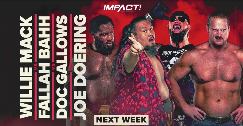 Doc Gallows vs. Fallah Bahh vs. Joe Doering vs. Willie Mack is set for a four-way after Gallows’ tag team partner Karl Anderson won a four-way over TJP, Rich Swann and Deaner Thursday.