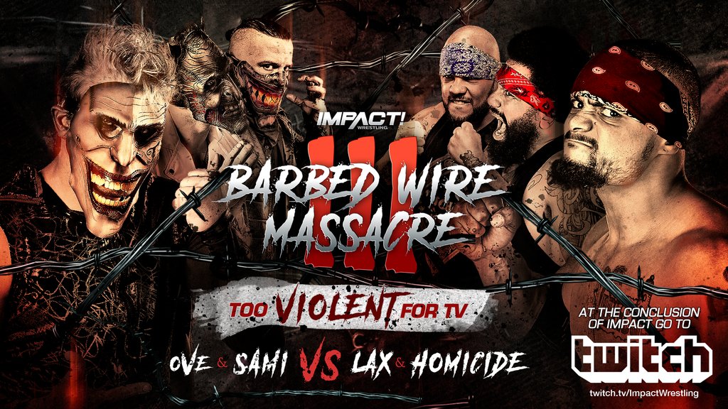 Tonight: Impact World Champion Eli Drake defends against Johnny Impact and Alberto El Patron in a triple threat match. After Impact, OVE battles LAX in the ultra-violent Barbed Wire Massacre III on Twitch.