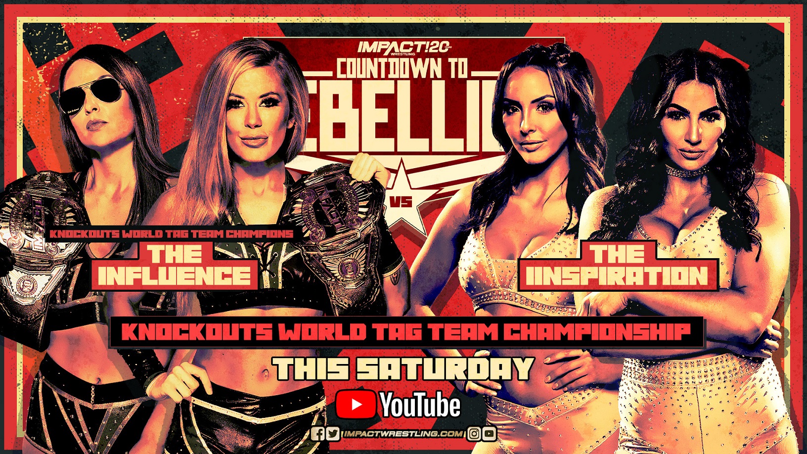 Impact Wrestling has announced that The Influence (Tenille Dashwood & Madison Rayne) will defend their Knockouts Tag Team titles against The IInspiration (Cassie Lee & Jessica McKay) on Countdown to Rebellion this Saturday. Countdown to Rebellion will air for free on YouTube starting at 7:30 p.m. Eastern time. The PPV main card begins at 8 p.m. Eastern.