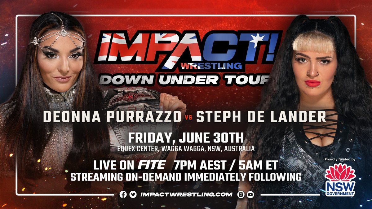 Impact Wrestling’s Down Under Tour takes place Friday, June 30, and Saturday, July 1, from the Equex Center in Wagga Wagga, NSW, Australia. Both shows will air as pay-per-view events on FITE TV. They will begin at 5 AM Eastern time and then be available on-demand after.
