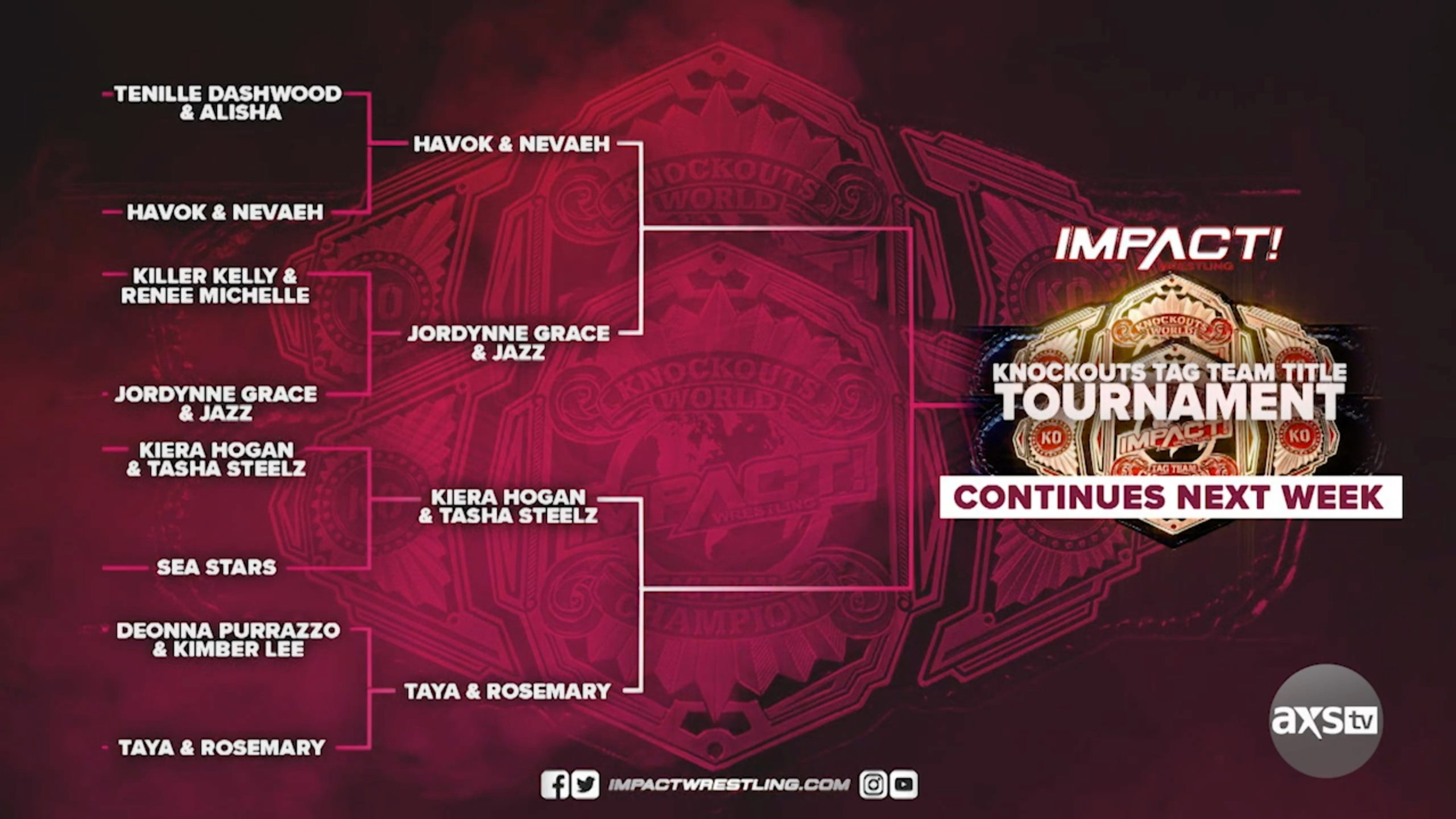 Havok & Nevaeh vs. Jordynne Grace & Jazz and Kiera Hogan & Tasha Steelz vs. Taya Valkyrie & Rosemary are the semifinal matches for the tournament. It will continue on next Tuesday’s episode of Impact.
