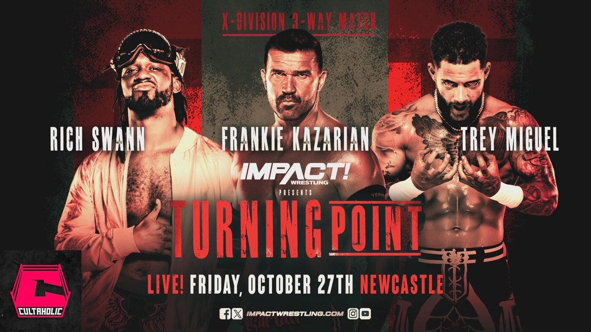 Rich Swann, Frankie Kazarian, and Trey Miguel will face off at Turning Point. The show is taking place in Newcastle, England on Friday, October 27 but won’t air on Impact Plus until November 3. It’s part of Impact Wrestling’s UK Invasion tour.
