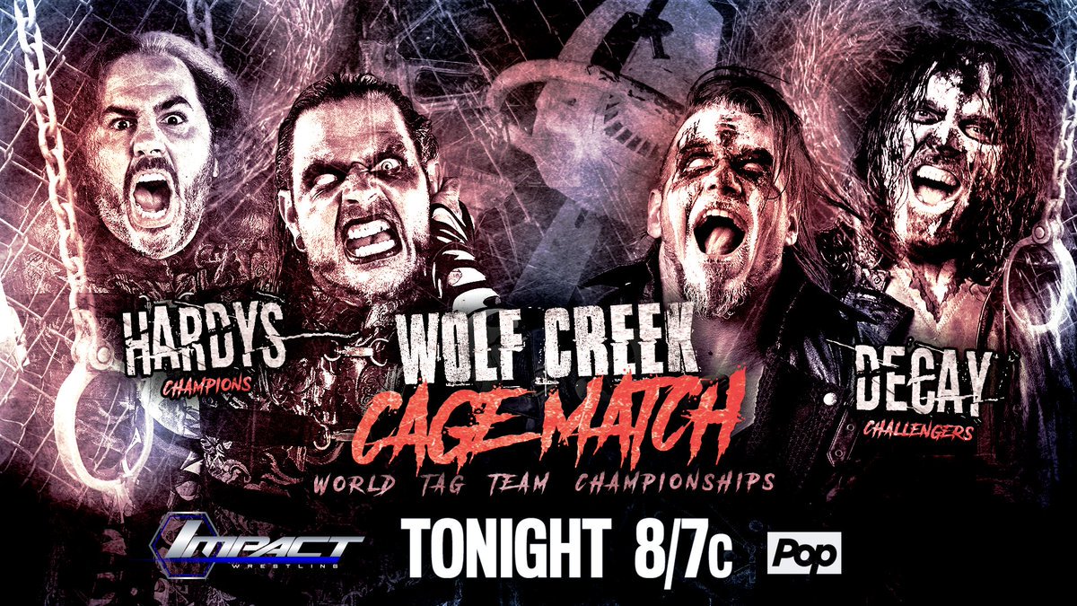 Tonight: On tonight’s show, new TNA Tag Team Champions The Broken Hardys will defend against Decay in a Wolf Creek Cage match. Also, Cody and Brandi Rhodes will make their Impact debuts.