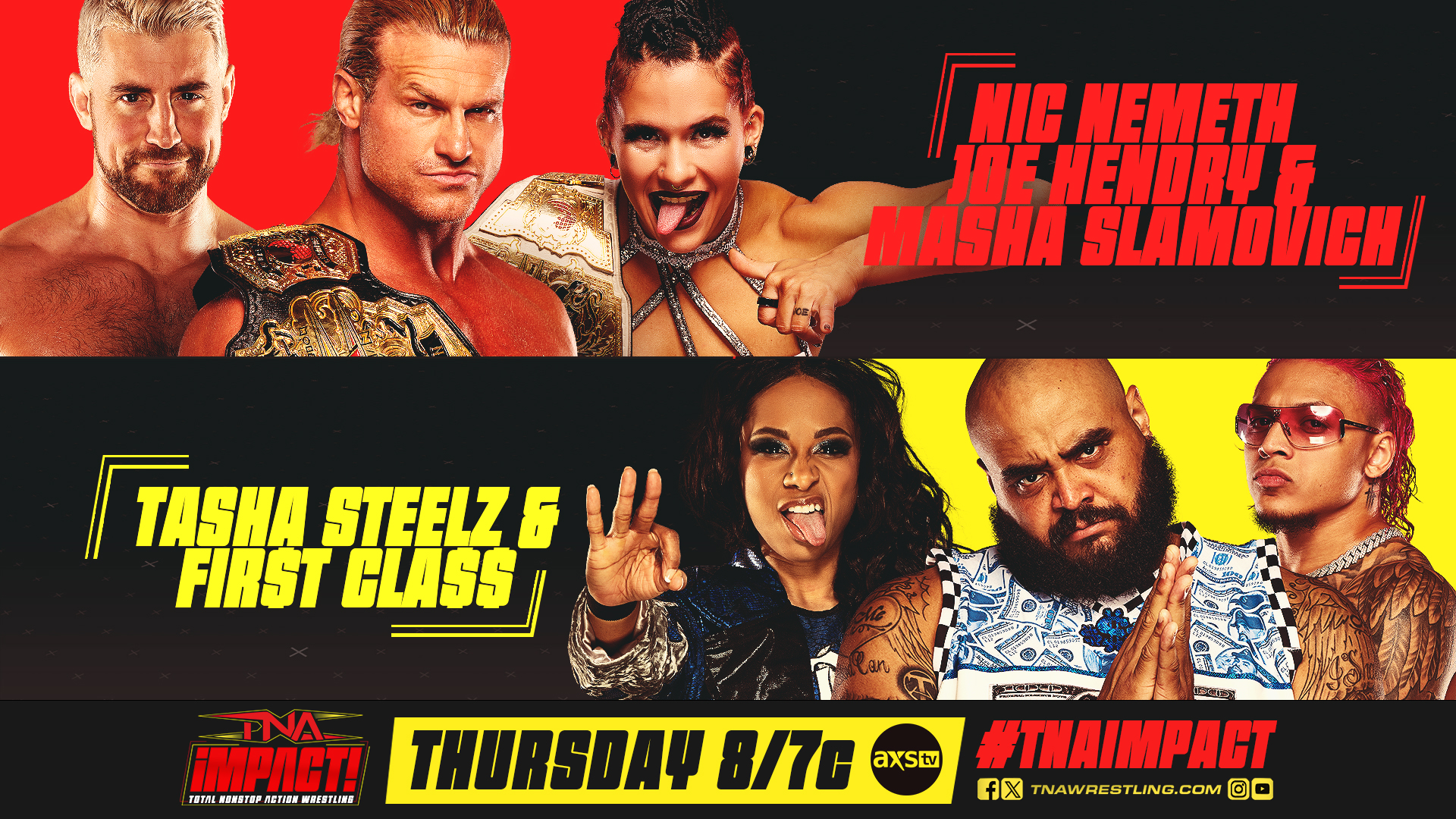 In the headliner, TNA World Champion Nic Nemeth teams with Knockouts Champion Masha Slamovich and Joe Hendry against AJ Francis, KC Navarro and Tasha Steelz. Nemeth defends against Francis and Slamovich will defend against Steelz on Friday.