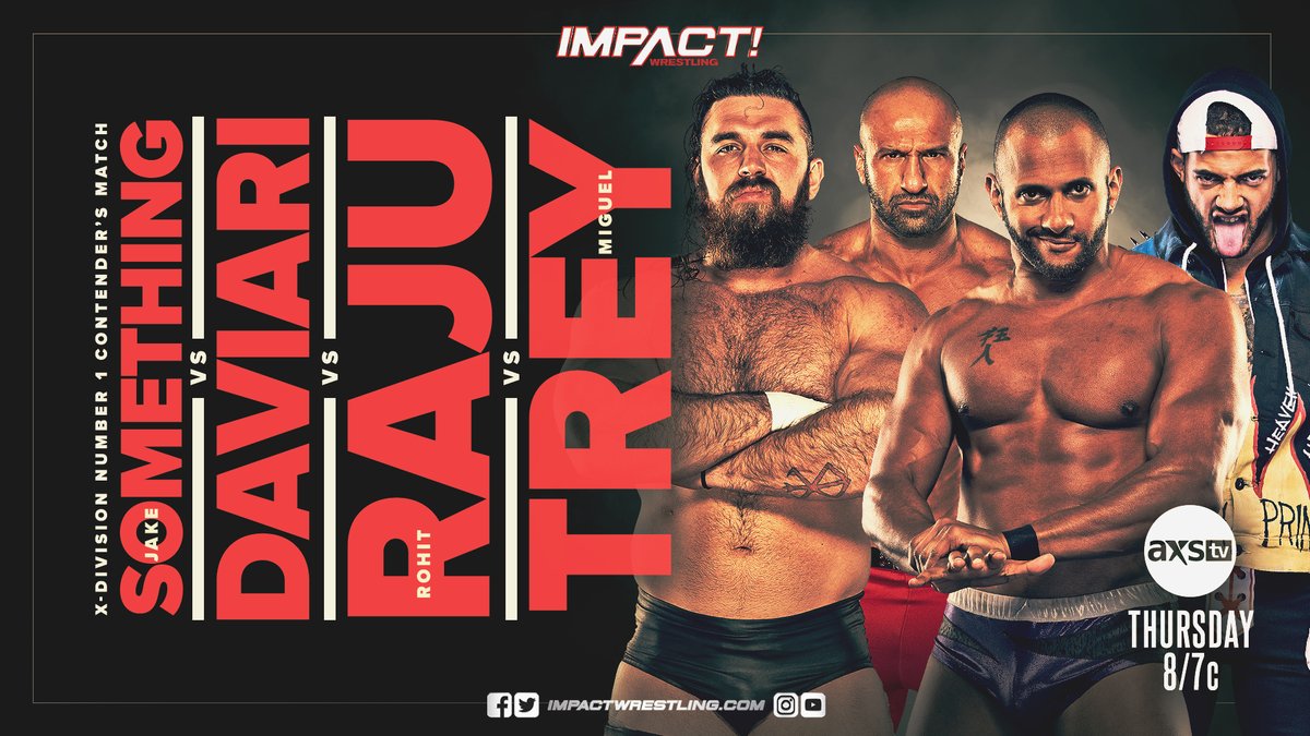 In a four-way for an X-Division title shot, Jake Something, Daivari, Rohit Raju and Trey Miguel will do battle. Raju is the only former champion in the match. The winner will look to challenge Alexander who has been on a roll since winning the title. He last defeated Black Taurus at Saturday’s Homecoming in his fifth successful title defense.
