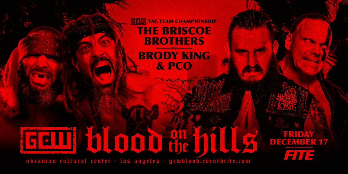 Game Changer Wrestling announced today that Jay & Mark Briscoe will defend their Tag Team titles against Brody King & PCO at Blood on the Hills on Friday, December 17. The show is taking place at the Ukrainian Cultural Center in Los Angeles and will be available live via Fite TV.