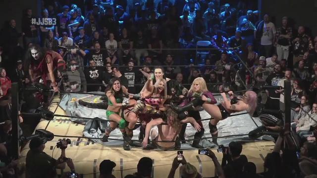 Jimmy Lloyd emerges from his ungodly violent deathmatch last night to start brawling and lands a rolling death valley driver. Takeda comes down to resume their war from last night. Then, Mantaur got an elimination. Jeff Cannonball brawls with Takeda and lands a tombstone in such a way that I’m astounded he didn’t tear both knees upon impact. Ethan Page is out to fight for his very soul. Essa Rios is out and looks about the same as he did 20 years ago, just a bit chunkier around the middle. Necro’s just gone before “Maneater” blares as Ashley Vox, Allie Kat, Maria Manic, Solo Darling, Su Yung, and Session Moth Martina are out. They run wild and beat the tar out of the men. Martina goes for a grind, but spits beer and lands a DDT. Stunt hits Ashley in the stomach, but she lands an air raid crash on him.