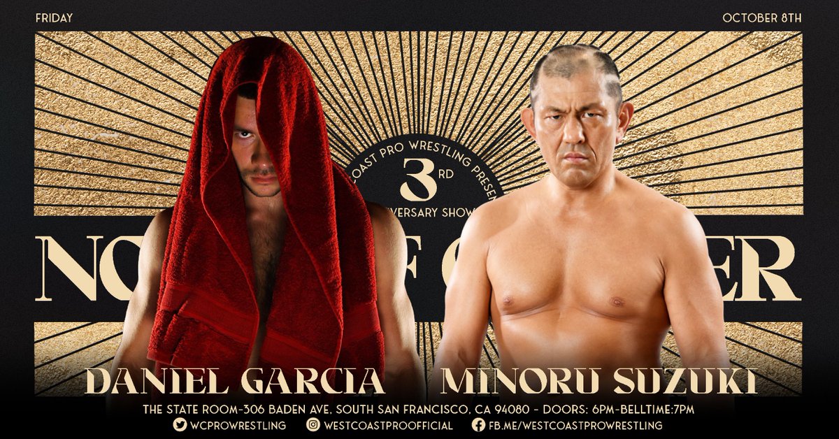 West Coast Pro Wrestling has announced that Suzuki vs. Garcia will take place at their “No Leaf Clover” event on Friday, October 8. The show is being held at The State Room in South San Francisco, California and will air live on IndependentWrestling.TV.