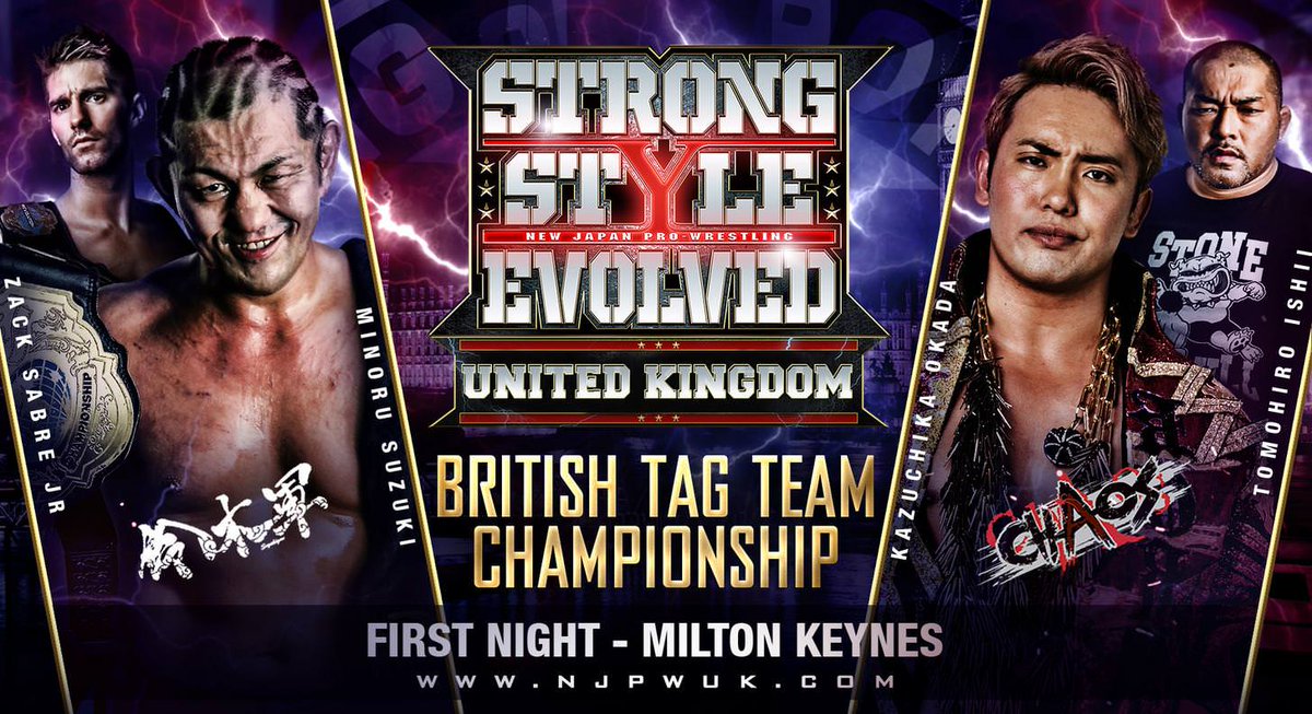 Headlined by a British Tag Team title match, the first night of NJPW’s Strong Style Evolved UK weekend kicked off in Milton Keynes on Saturday. Today’s show in Manchester has Undisputed British Heavyweight Champion Tomohiro Ishii vs. Minoru Suzuki and Kazuchika Okada vs. Zack Sabre Jr.