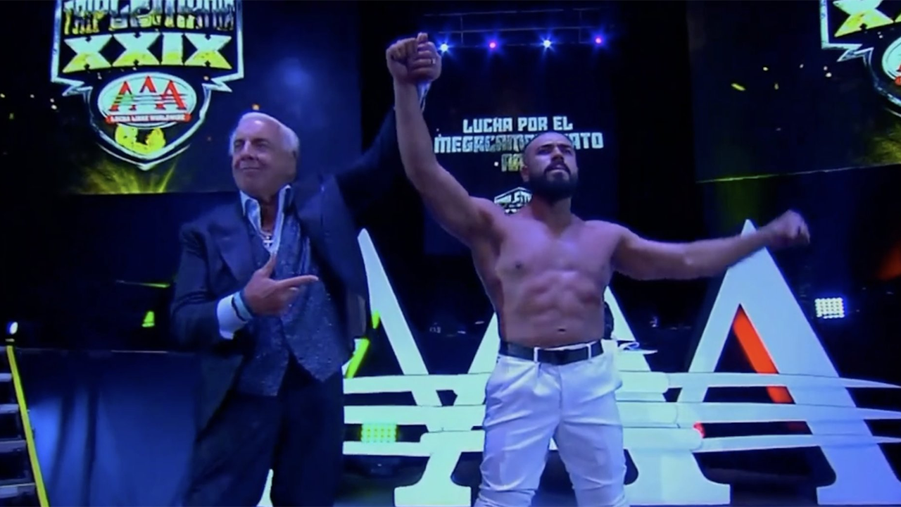 Omega retained the AAA title over El Idolo Saturday in a match that saw Ric Flair make a surprise appearance to be in El Idolo’s corner. Omega was setting up to hit El Idolo with a chair shot but Flair intervened. Konnan (in Omega’s corner) also got involved and after a chaotic scene that saw Flair put Konnan in a figure four, Omega eventually hit El Idolo with the title belt and after hitting the One Winged Angel, he pinned El Idolo to retain.