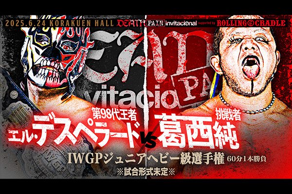 El Desperado will put the IWGP Junior Heavyweight Championship on the line against Jun Kasai June 24 at Death Pain Invitacional!https://t.co/3RPXRyzEnz#deathpaininvi pic.twitter.com/N6pSFSok0p