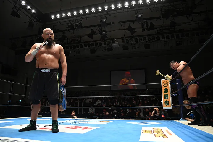 O-Khan and Taichi’s match on Monday was contested under Best two out of three fall rules. Taichi claimed the first fall in a sumo match by forcing O-Khan to the outside. The champion then picked up the second fall despite questionable officiating by special referee Yoshinobu Kanemaru. The final fall was a Last Man Standing match, and it was declared a draw when neither competitor could make the referee’s count.