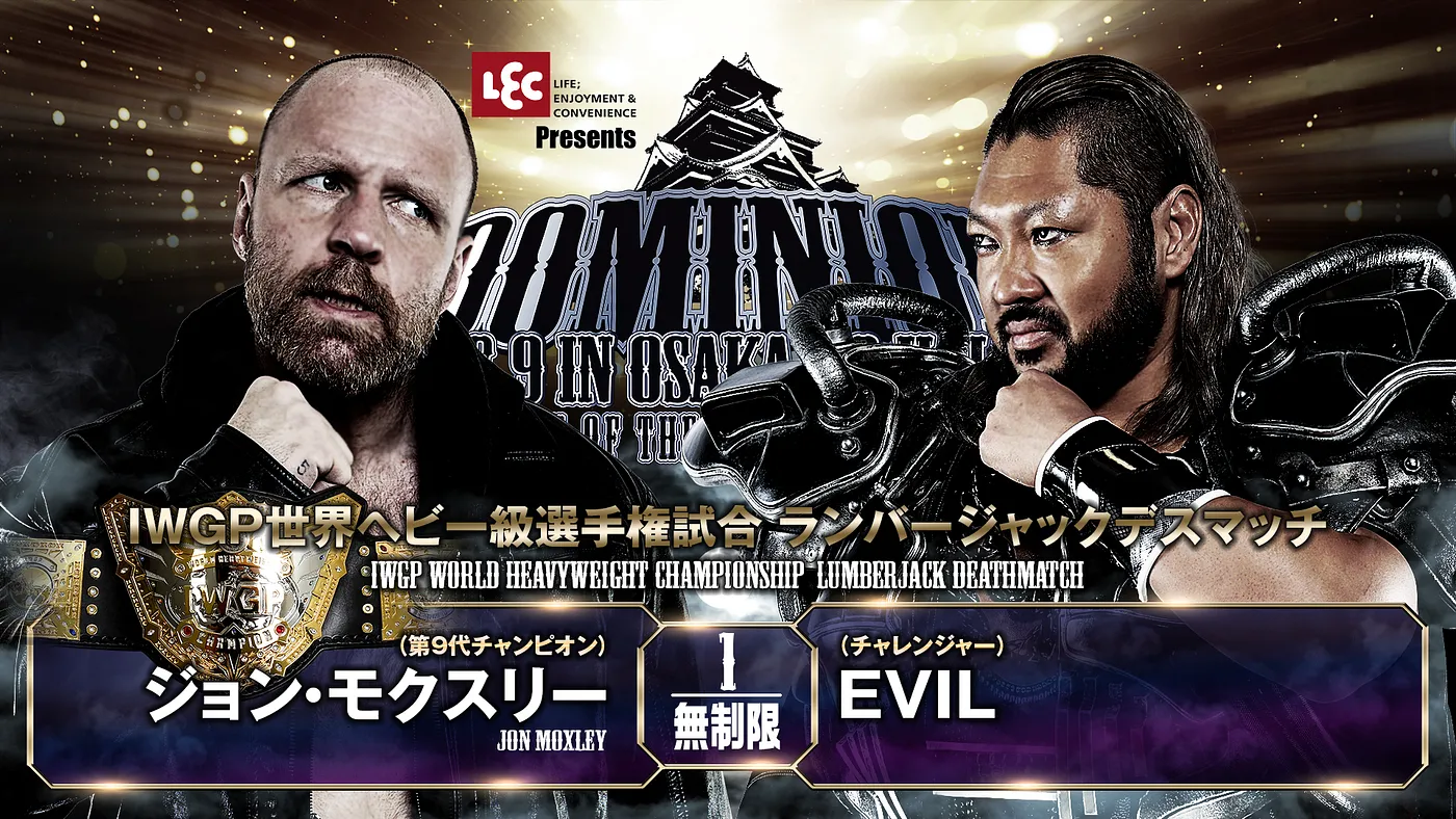 IWGP World Heavyweight Champion Jon Moxley defends his title against EVIL in a lumberjack death match in the other half of the main event.