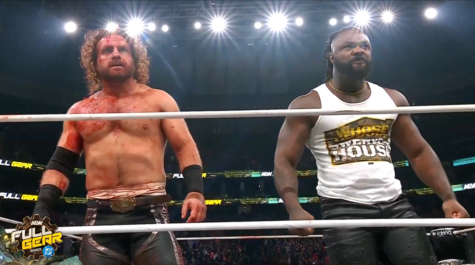 Post-match: Plucking at the remains of the now former champion, the celebratory House of Torture were interrupted by Aaron Wolf.