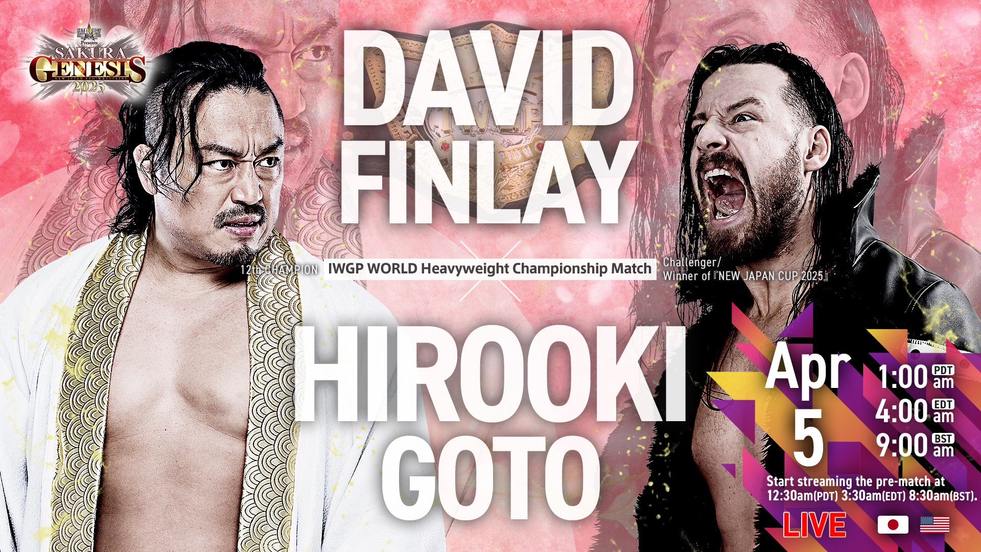 Hirooki Goto defending the IWGP World Heavyweight Championship against David Finlay headlines today’s NJPW Sakura Genesis.