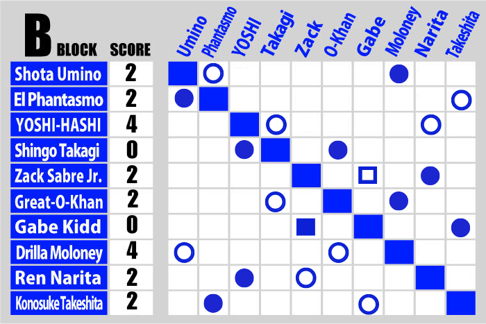 - B Block: El Phantasmo defeated Konosuke Takeshita