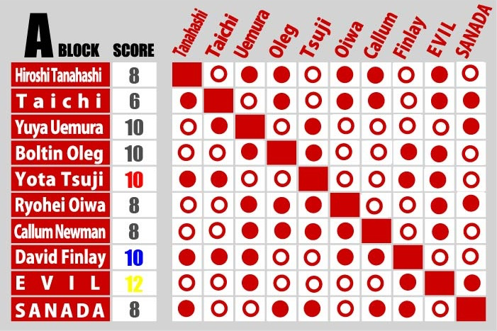 A four-way tie at 10 points followed EVIL in the standings, with David Finlay and Yota Tsuji advancing on tie-breakers (head-to-head record among all tied competitors). Finlay will face the third-place wrestler from B Block in the quarterfinals on August 14, while Tsuji will face the second-place finisher from the group. Finlay booked his spot in the knockout stage with a win over Yuya Uemura in the main event, and Tsuji defeated Callum Newman. A detailed report of today’s show via Corey Michaels is available here.