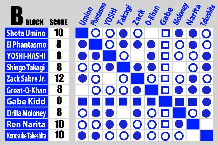 - B Block: Shingo Takagi (8 points) vs. Drilla Moloney (8 points)
