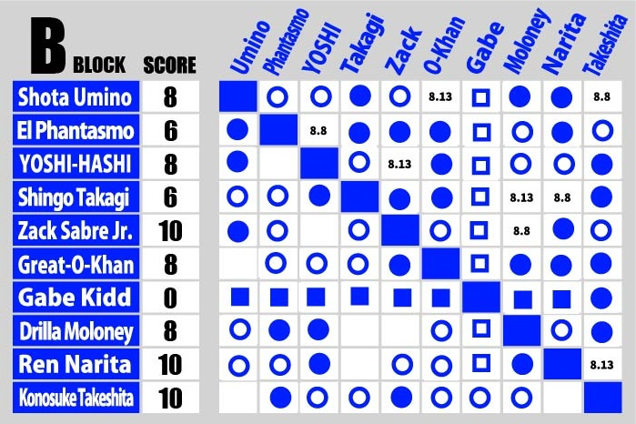 Narita, Konosuke Takeshita, and Sabre sit atop B Block with 10 points. They are followed by Drilla Moloney, YOSHI-HASHI, Great-O-Khan, and Umino with 8 points. El Phantasmo sits at 6 points, including his default victory over Gabe Kidd scheduled for the final night, and is eliminated. Takagi also has 6 points and would need to win out and receive considerable help to have any chance of advancing.
