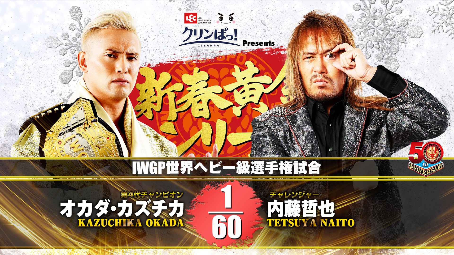 Kazuchika Okada defends the IWGP World Heavyweight Championship against Tetsuya Naito in the main event of the final night of NJPW New Year’s Golden Series.