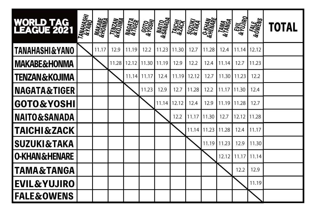 12 teams will compete in a round robin tournament, with the top two teams with the most points meeting in the finals December 15 in Sumo Hall along with the finals of the Best of the Super Juniors tournament. The winners of the World Tag League tournament will meet IWGP Tag Team Champions Taichi & Zack Sabre Jr. at Wrestle Kingdom 16.