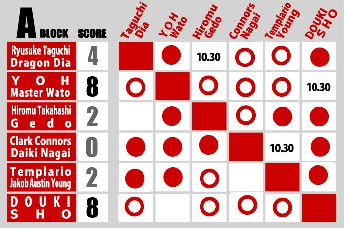 - A Block: YOH & Master Wato (3-0): 6 points defeated Hiromu Takahashi & Gedo (1-2): 2 points
