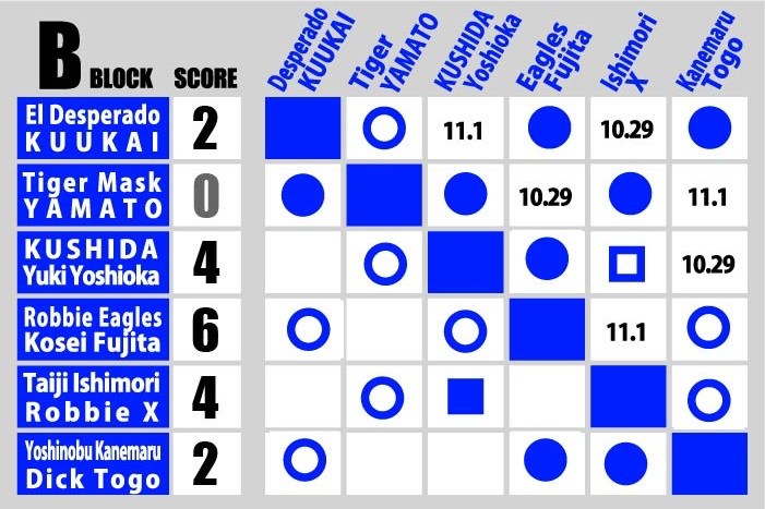 - B Block: Tiger Mask & YAMATO (0-3): 0 pointsvs. Robbie Eagles & Kosei Fujita (3-0): 6 points