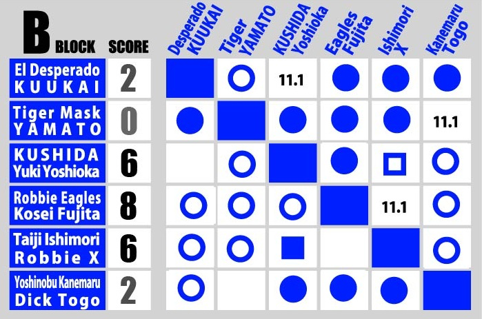 - B Block: KUSHIDA & Yuki Yoshioka (3-1): 6 points vs. El Desperado & KUUKAI (1-3): 2 points