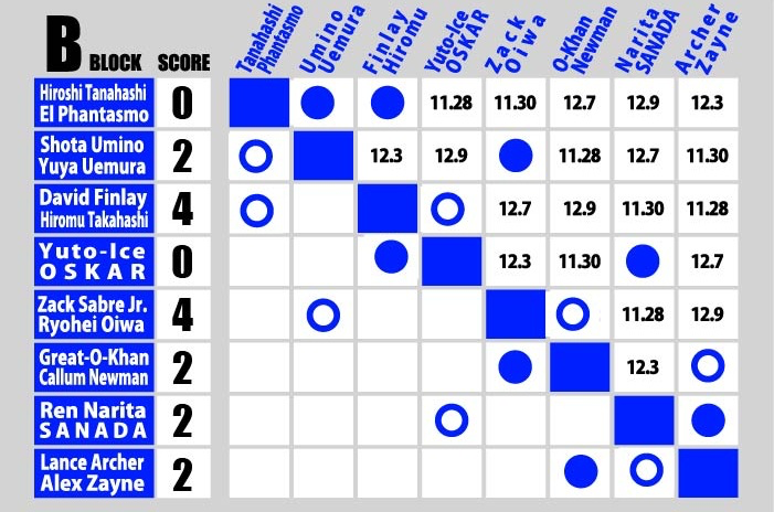- B Block: David Finlay & Hiromu Takahashi (2-0) defeated Hiroshi Tanahashi & El Phantasmo (0-2)