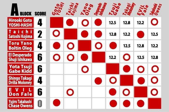 - A Block: El Desperado & Shuji Ishikawa (3-1) defeated Bishamon (Hirooki Goto & YOSHI-HASHI) (2-2)