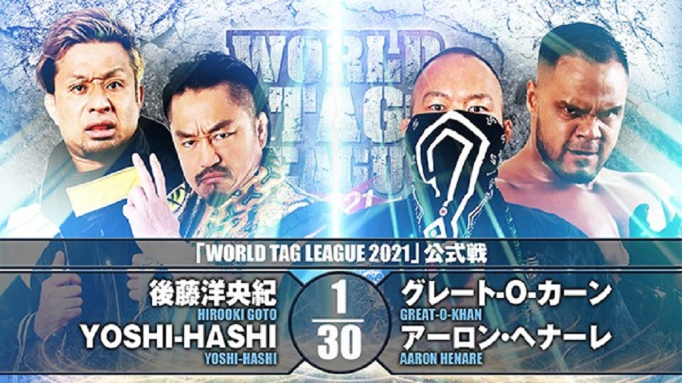 World Tag League: Hirooki Goto & YOSHI-HASHI defeated Great-O-Khan & Aaron Henare (19:43)