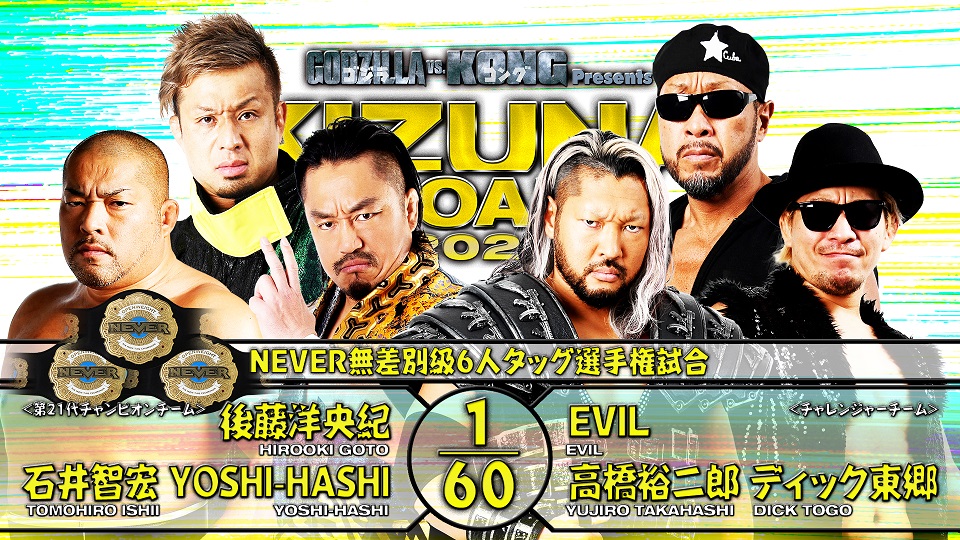 The NEVER Openweight Six-Man Tag Team titles were on the line in the main event, with Hirooki Goto, Tomohiro Ishii and YOSHI-HASHI defending against EVIL, Yujiro Takahashi and Dick Togo.