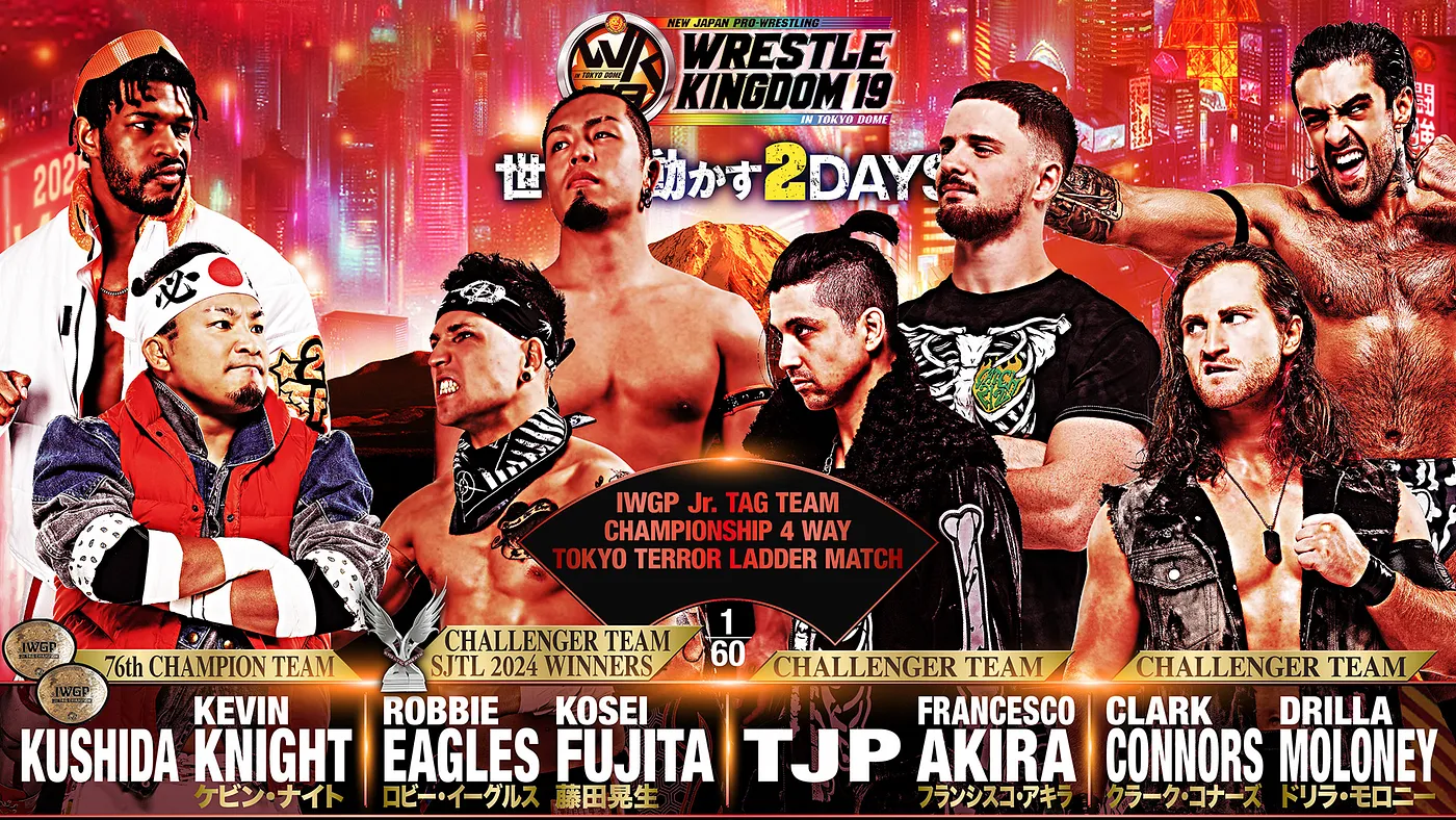 “After a tag team preview in Korakuen Hall for Ichiban Sweet Boys and the Intergalactic Jet Setters saw Clark Connors and Drilla Moloney get involved with steel chairs, Catch 2/2 joined the mix,” NJPW’s website explained. “Soon chairs were joined by tables and ladders, prompting Kosei Fujita to suggest that as Super Jr. Tag League winners, he and Robbie Eagles were willing to make use of all the hardware in the Tokyo Dome. KUSHIDA and Kevin Knight accepted, and now a Tokyo Terror Ladder Match is set for Wrestle Kingdom 19!”