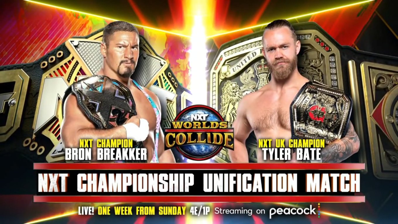 NXT Champion Bron Breakker will face NXT UK Champion Tyler Bate in a title unification match at Worlds Collide on Sunday, September 4. The match was announced during Tuesday’s WWE NXT episode.