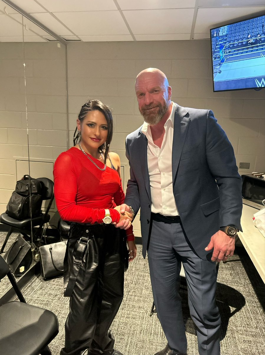 Giulia tweeted a photo of her shaking hands with Paul “Triple H” Levesque backstage at the event. Levesque responded: