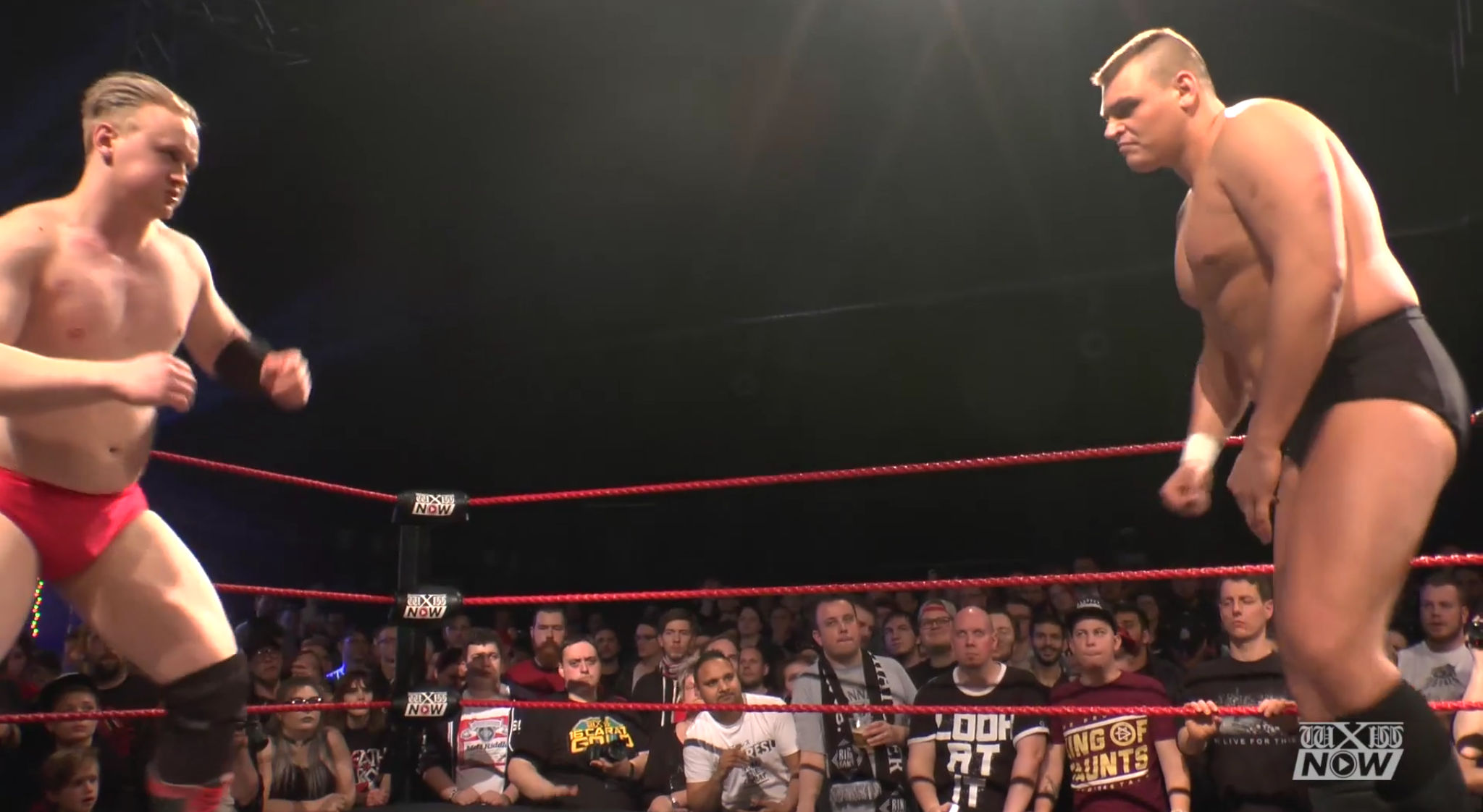 Bate and Dragunov battled it out with Dragunov hitting a running senton, followed with a few stiff chops to Bate’s neck. Bate lifted Dragunov up and looked to get him over the rope and then landed a punch to Dragunov’s jaw.
