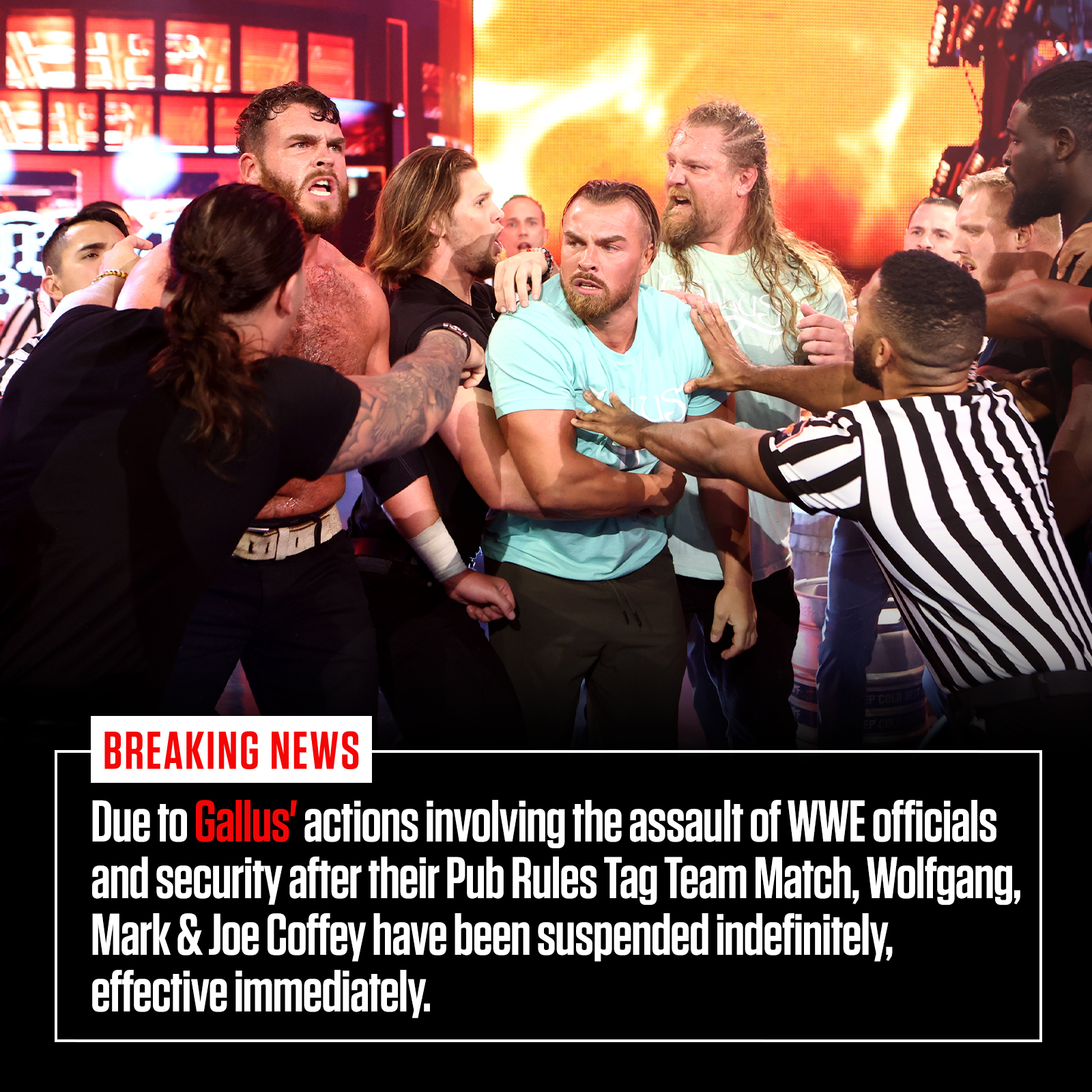 “Due to Gallus’ actions involving the assault of WWE officials and security after their Pub Rules Tag Team Match, Wolfgang, Mark & Joe Coffey have been suspended indefinitely, effective immediately.”