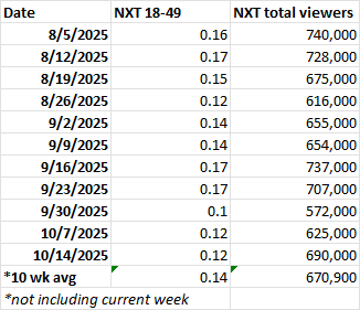 Listed below are the last 11 weeks of viewership numbers and 18-49 demo ratings for NXT. Prior to the September 30 show, numbers were still measured by the old panel-only system. This week’s show was up 2.8 percent in viewers but down 14.3 percent in 18-49 as compared to the recent averages.