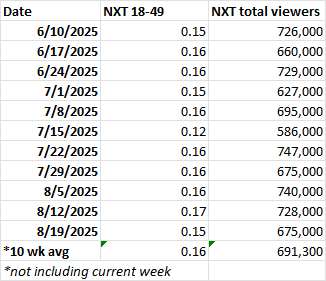 Listed below are the last 11 weeks of viewership numbers and 18-49 demo ratings for NXT, as well as the 10-week average in both categories. This week’s episode was down 2.4 percent in viewers and 6.3 percent in 18-49 as compared to the recent averages.