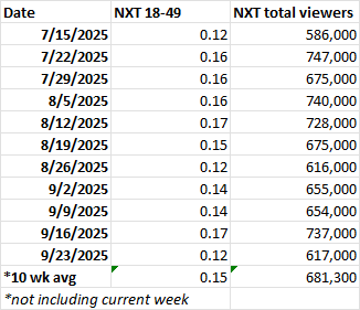 In the 18-49 demo, NXT drew a 0.12 rating. That’s down 29.4 percent from last week and ties the lowest rating the show has done in that category in 2025. NXT tied for last place on network television with most of those stations airing new programming for the first time this fall season.