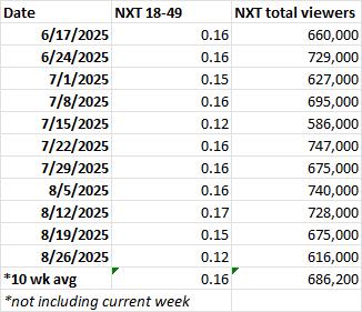 NXT averaged a 0.12 rating in the 18-49 demo, down 20% from last week and tying the lowest rating the show has done in that category since February 7, 2023. It only beat one other show on network television (a repeat of Will Trent on ABC) after finishing in the top ten for the last several weeks.