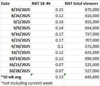 As compared to the same week in 2024, under the old panel-only system, NXT’s overall viewership was down 10.4 percent while the 18-49 rating was down 50 percent.