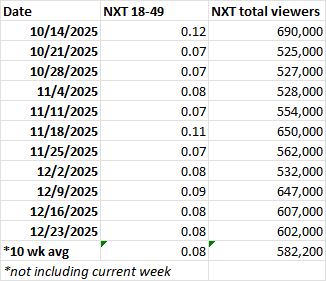 As compared to the same week in 2024 (under Nielsen’s old panel-only ratings measurement system), NXT’s overall viewership was down 16.7 percent while the 18-49 rating was down 42.9 percent.