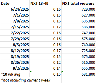 As compared to the same week in 2024, when the show still aired on USA Network, NXT’s overall viewership was up 3.8 percent while the 18-49 rating was down 17.8 percent.
