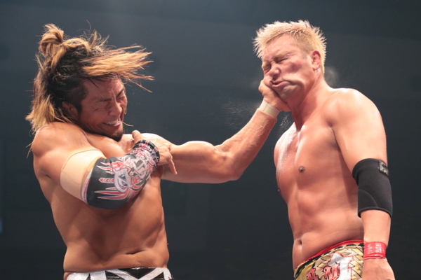 They traded elbows, and Tanahashi dropped Okada three times in the exchange. Okada missed a dropkick. Tanahashi blocked a flapjack and turned it into a twist and shout and a sling blade. He went for the high fly flow, but Okada moved. Okada then hit a dropkick to the back and another dropkick to the front. Okada tried the rainmaker, but Tanahashi hit the sling blade. Tanahashi did a high fly flow to the back, and went for his winning high fly flow, but Okada got his knees up. Okada hit a German suplex and Tanahashi kicked out at one. Tanahashi ducked a rainmaker and hit a dragon suplex. Okada hit the dropkick and Tanahashi hit the sling blade. Tanahashi went to the top for another high fly flow, but this time Okada dropkicked him as he flew off. Okada went for the rainmaker, but Tanahashi ducked and hit the rainmaker on Okada, who kicked out at one.