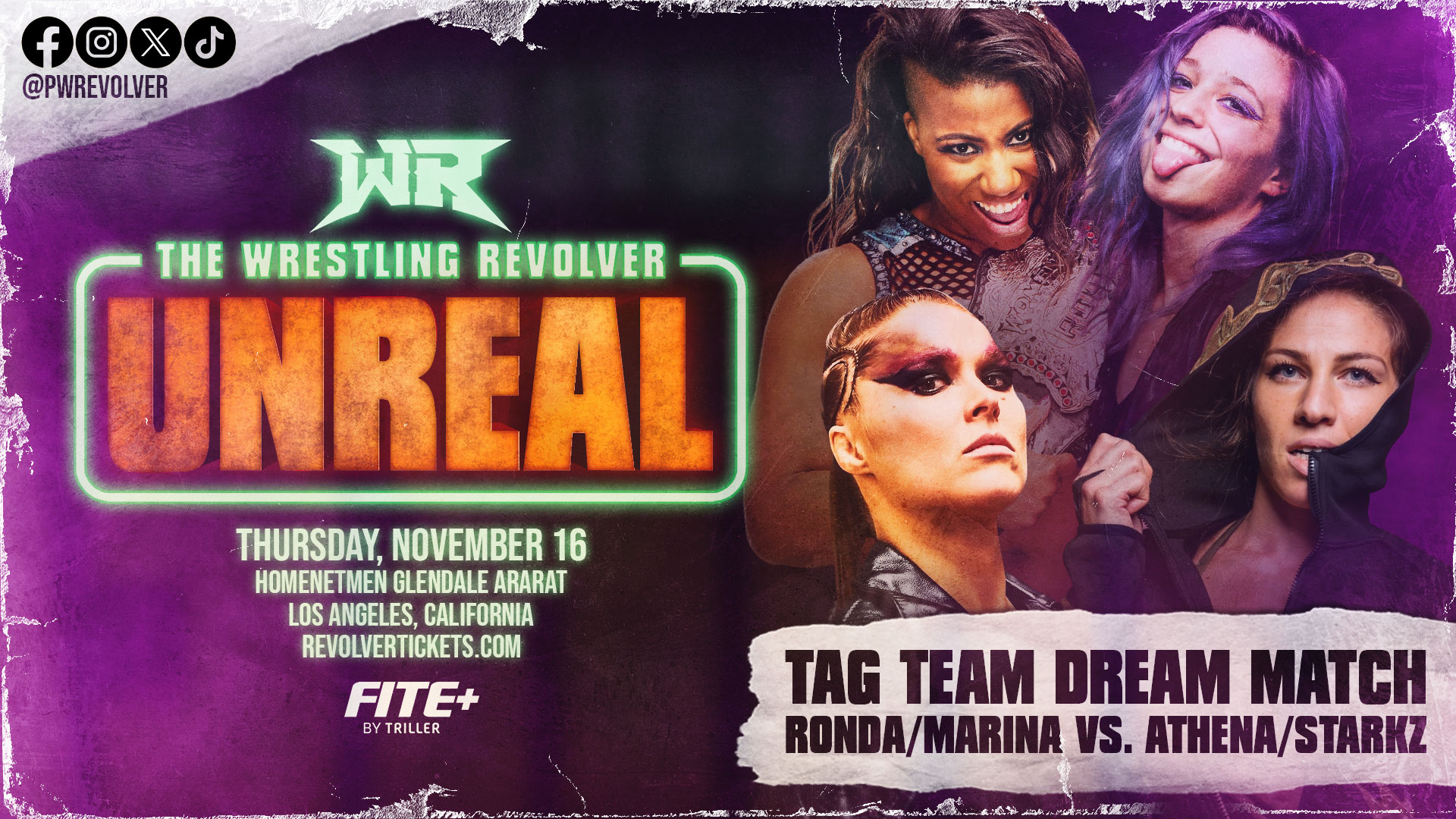 In a social media post Thursday, Wrestling Revolver officially announced Rousey & Shafir vs. ROH Women’s World Champion Athena & Billie Starkz for its Thursday, November 16 Unreal event.